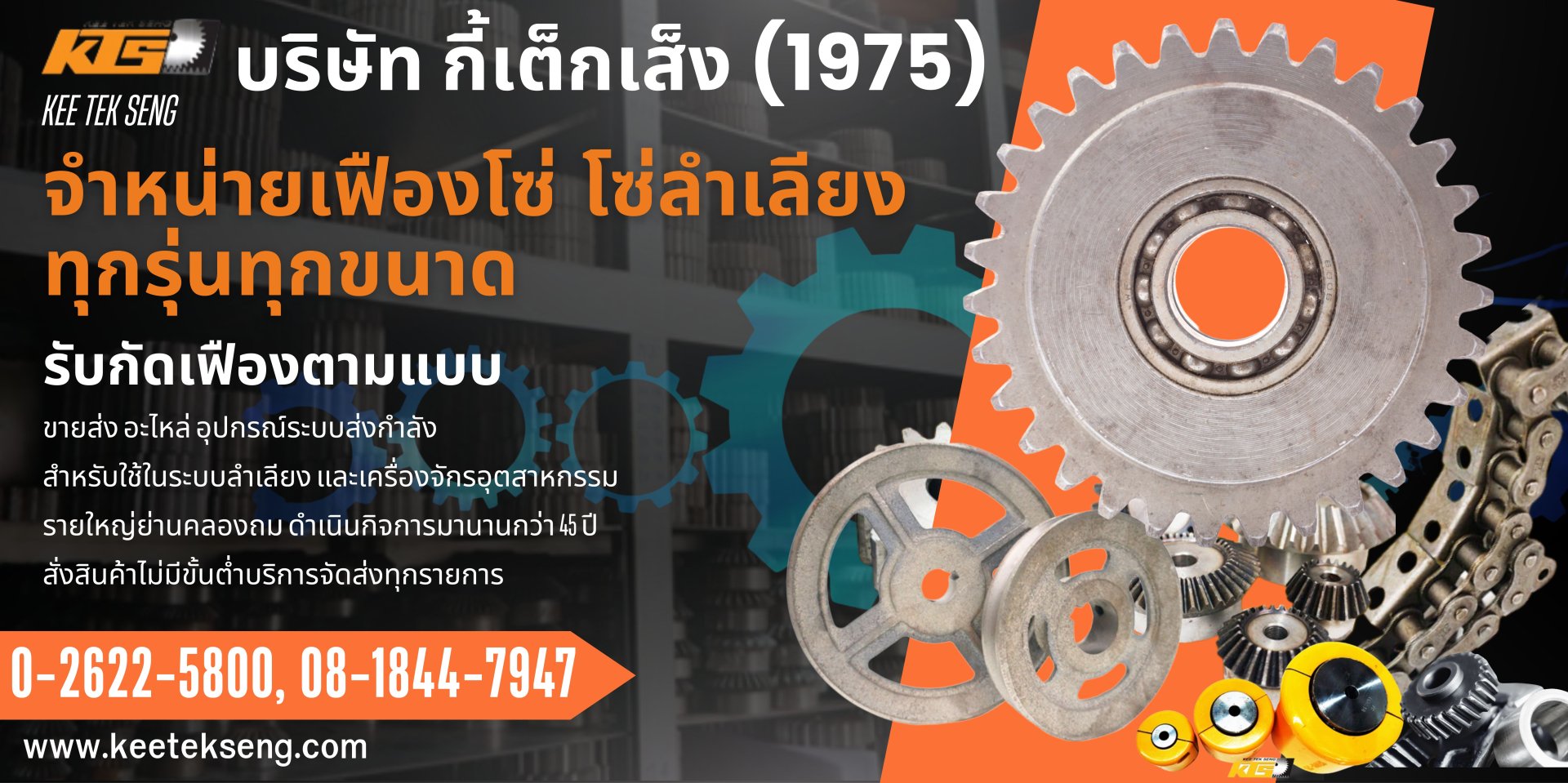 บริษัท กี้ เต๊กเส็ง (1975) จำกัด ดำเนินกิจการมากว่า 45 ปี ขายส่งเฟือง อะไหล่ อุปกรณ์กำลังส่งใช้ในระบบลำเลียง สำหรับเครื่องจักรอุตสาหกรรมขายปลีก ขายส่ง เฟืองโซ่ เฟืองโซ่ลำเลียง เฟืองอุตสาหกรรม โซ่ลำเลียง มู่เลย์ มู่เลย์เตเปอร์บูช ยอยโซ่ ยอยโซ่เพาเวอร์ล็อค คัปปลิ้งโซ่ เกียร์ทดรอบ มอเตอร์ไฟฟ้า มอเตอร์เกียร์ พวงมาลัยมือหมุน เกลียวแม่แรง ปั๊มหอยโข่ง เฟืองเรามีให้เลือกหลายขนาด หลายแบบ ทั้งเฟืองดุม เฟืองเฟืองตัวหนอน เฟืองดอกจอก เฟืองเฉียง เฟืองวงแหวน เฟืองสะพาน เฟืองตรง เฟืองเฉียงก้างปลา เฟืองเกลียวสกรู สินค้ามีพร้อมส่ง